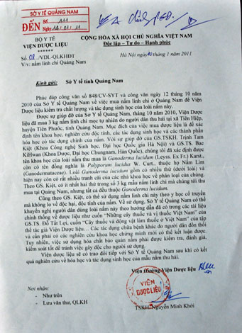 Công văn của Viện Dược liệu – Bộ Y tế gửi Sở Y tế tỉnh Quảng Nam xác nhận nấm lim xanh thuộc nhóm Ganoderma lucidum và khuyến khích sử dụng.
